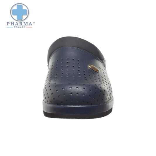 Scholl navy blue leather clog with perforated gold ornament, 1 unit